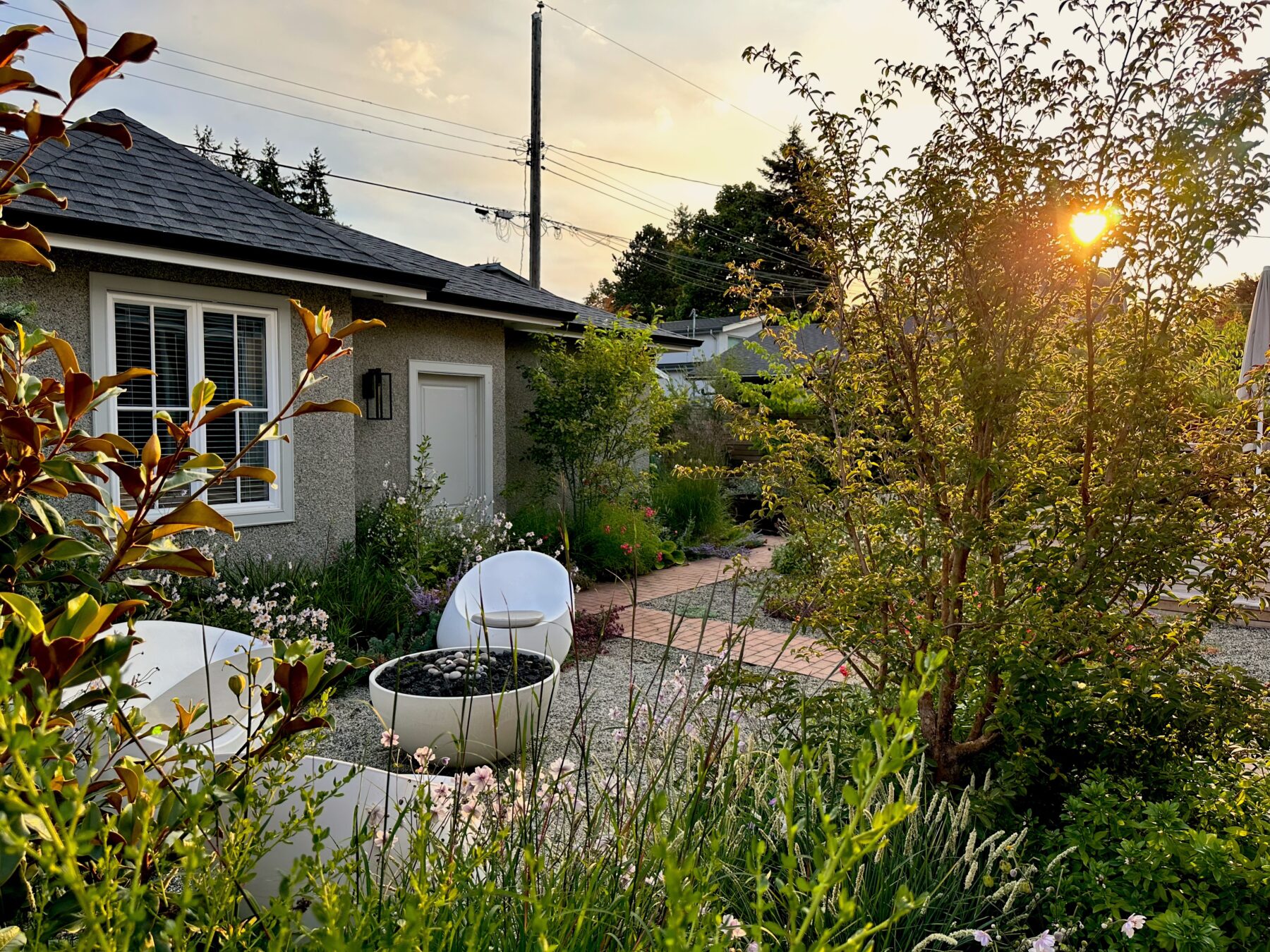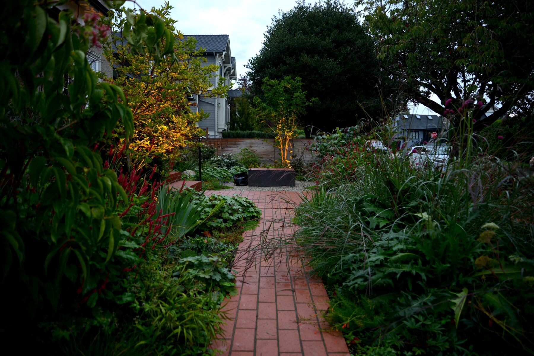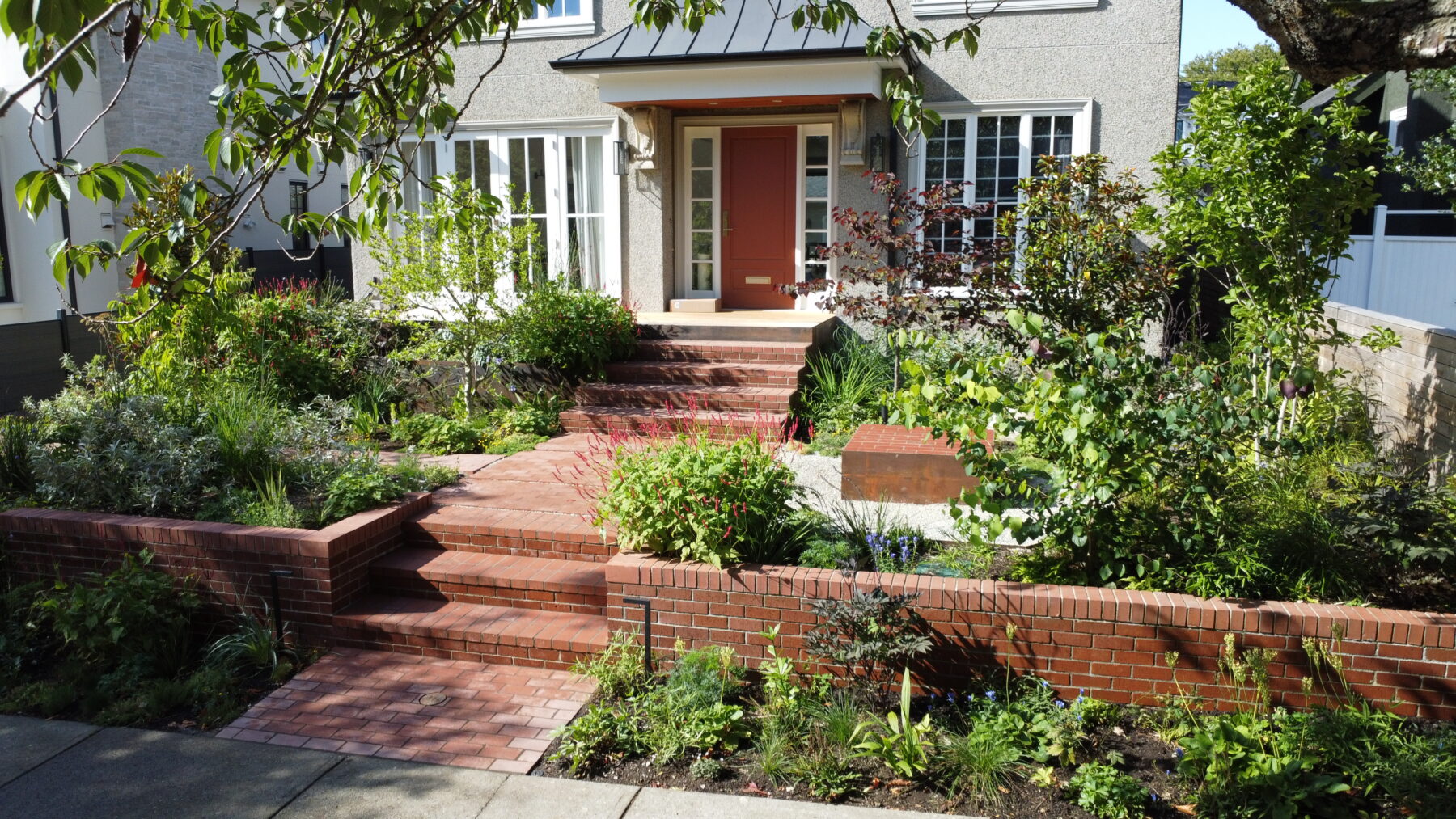 In the frontyard, the irregular terrain was levelled and contained, and the entry porch was extended west into a narrow seating/viewing area. A shallow copper dish sits on a plinth, as much a focal point as a treat to visiting birds. The material palette – local cedar, traditional brick pavers and raw steel – all contribute to the overall warmth of this ambitious little garden.
