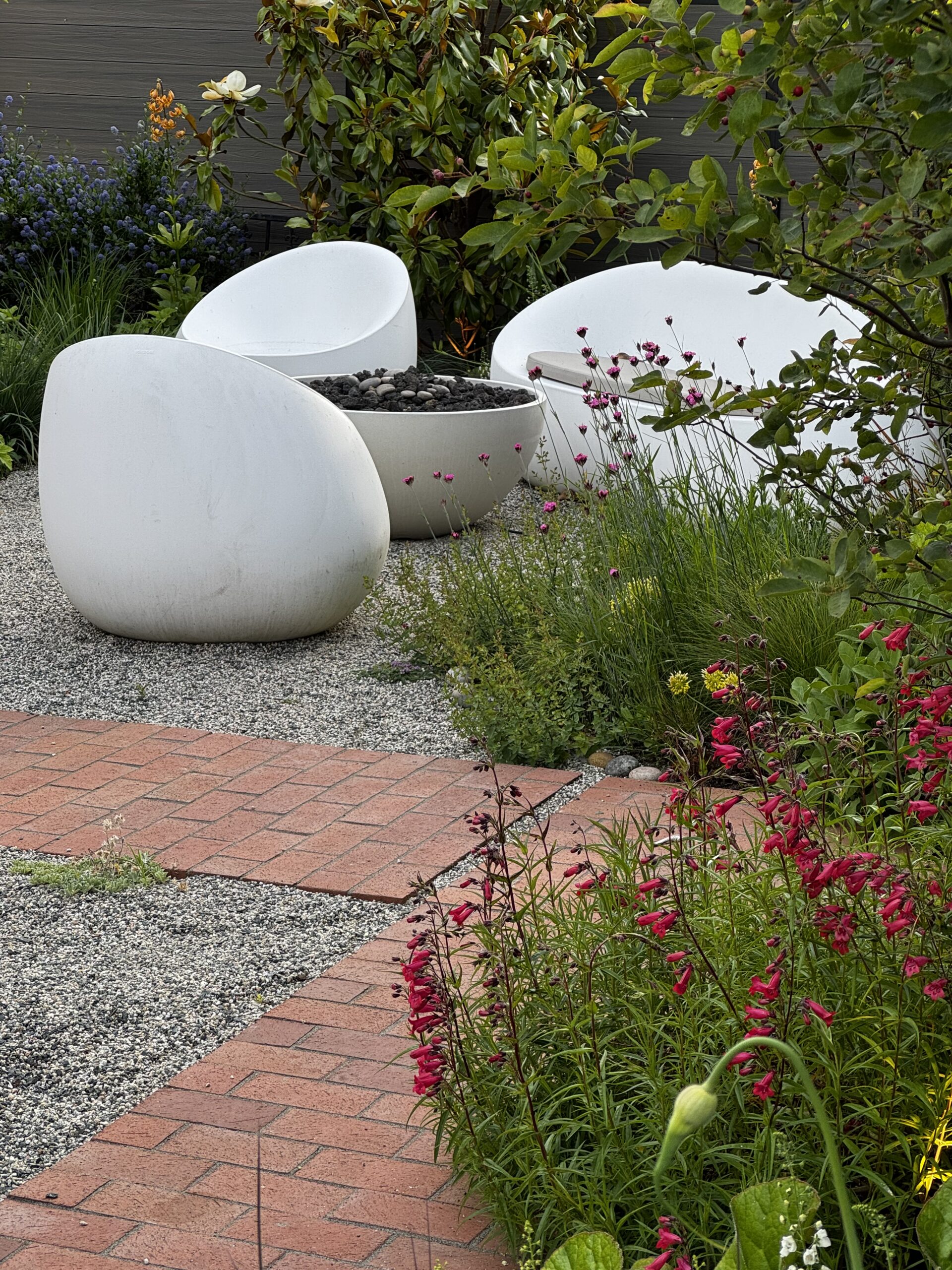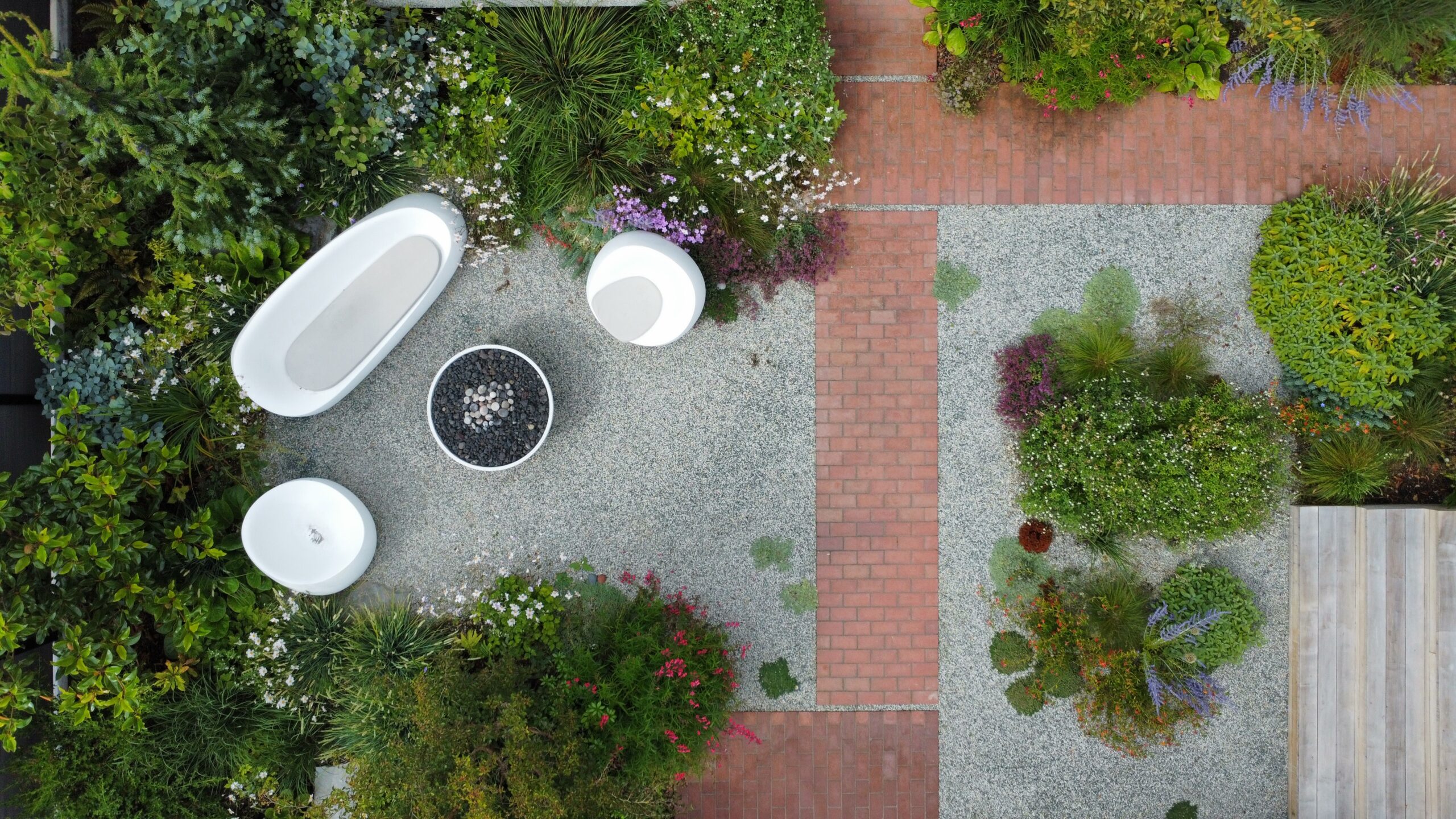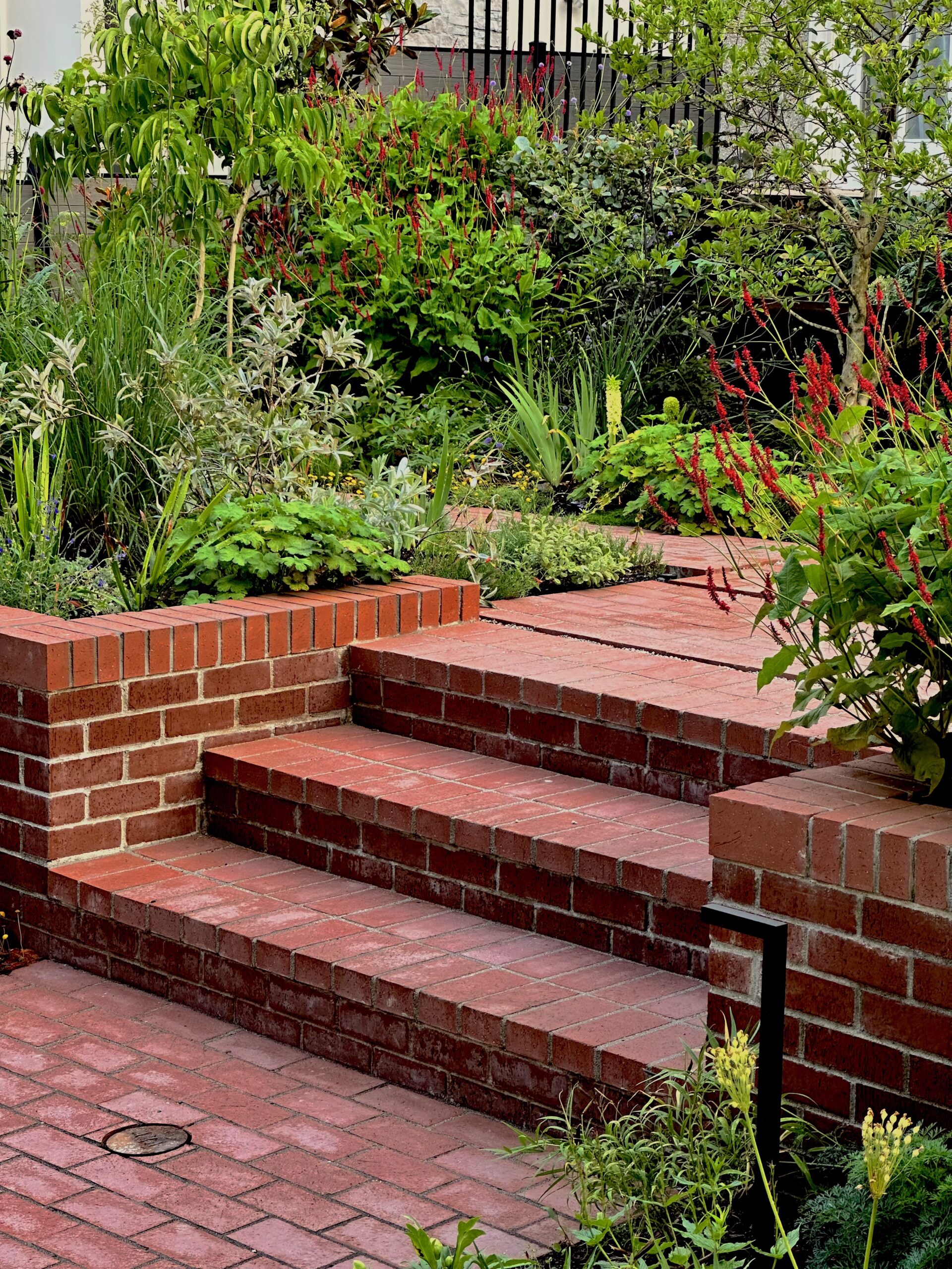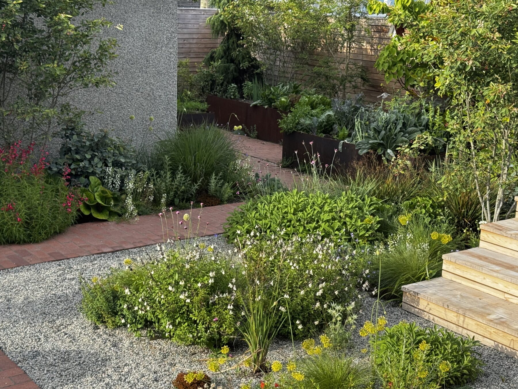 In the frontyard, the irregular terrain was levelled and contained, and the entry porch was extended west into a narrow seating/viewing area. A shallow copper dish sits on a plinth, as much a focal point as a treat to visiting birds. The material palette – local cedar, traditional brick pavers and raw steel – all contribute to the overall warmth of this ambitious little garden.