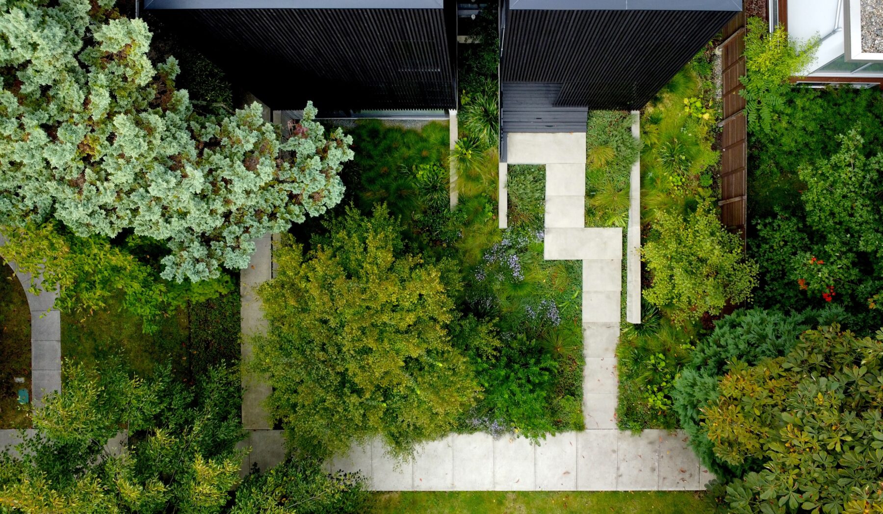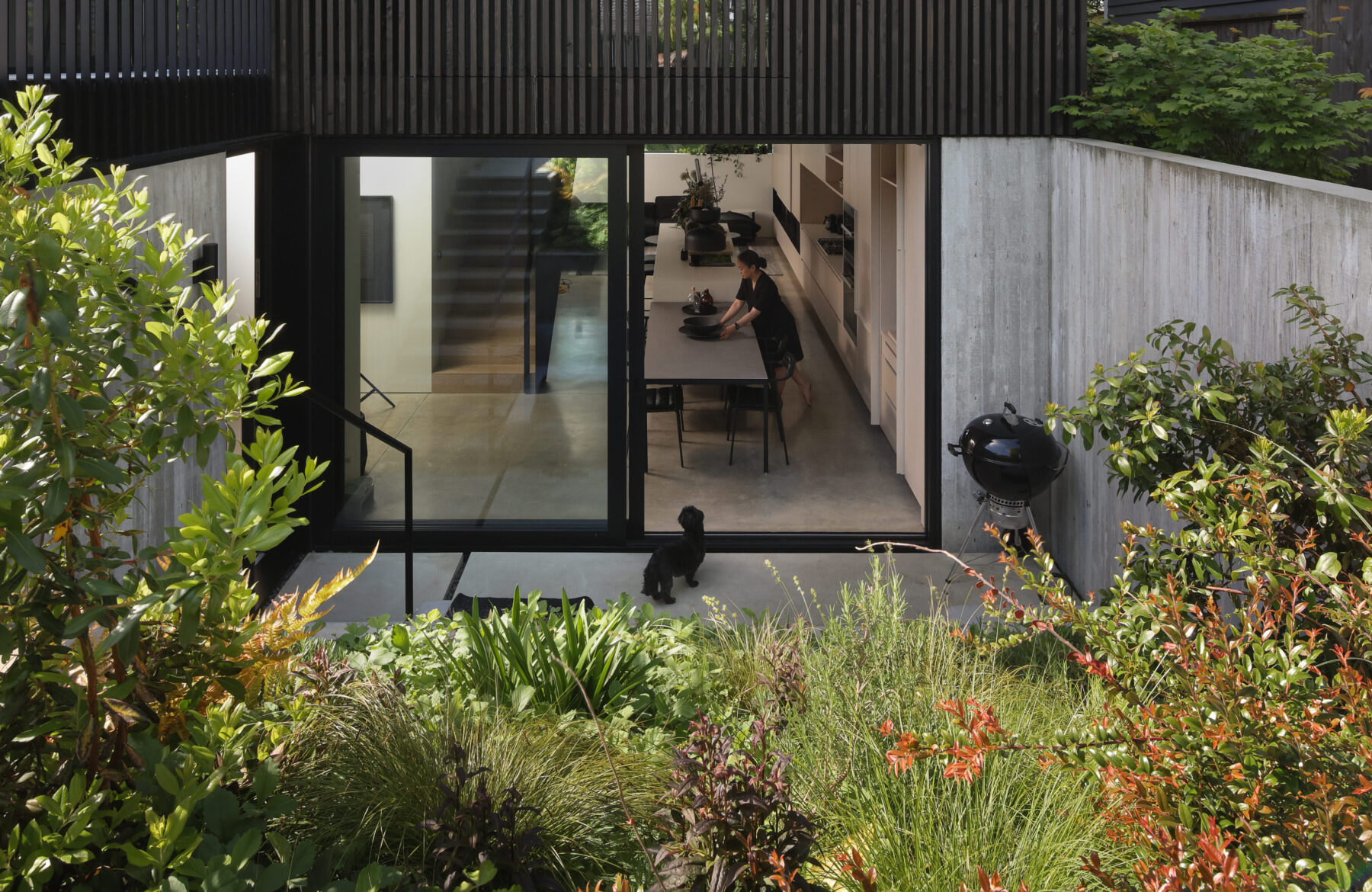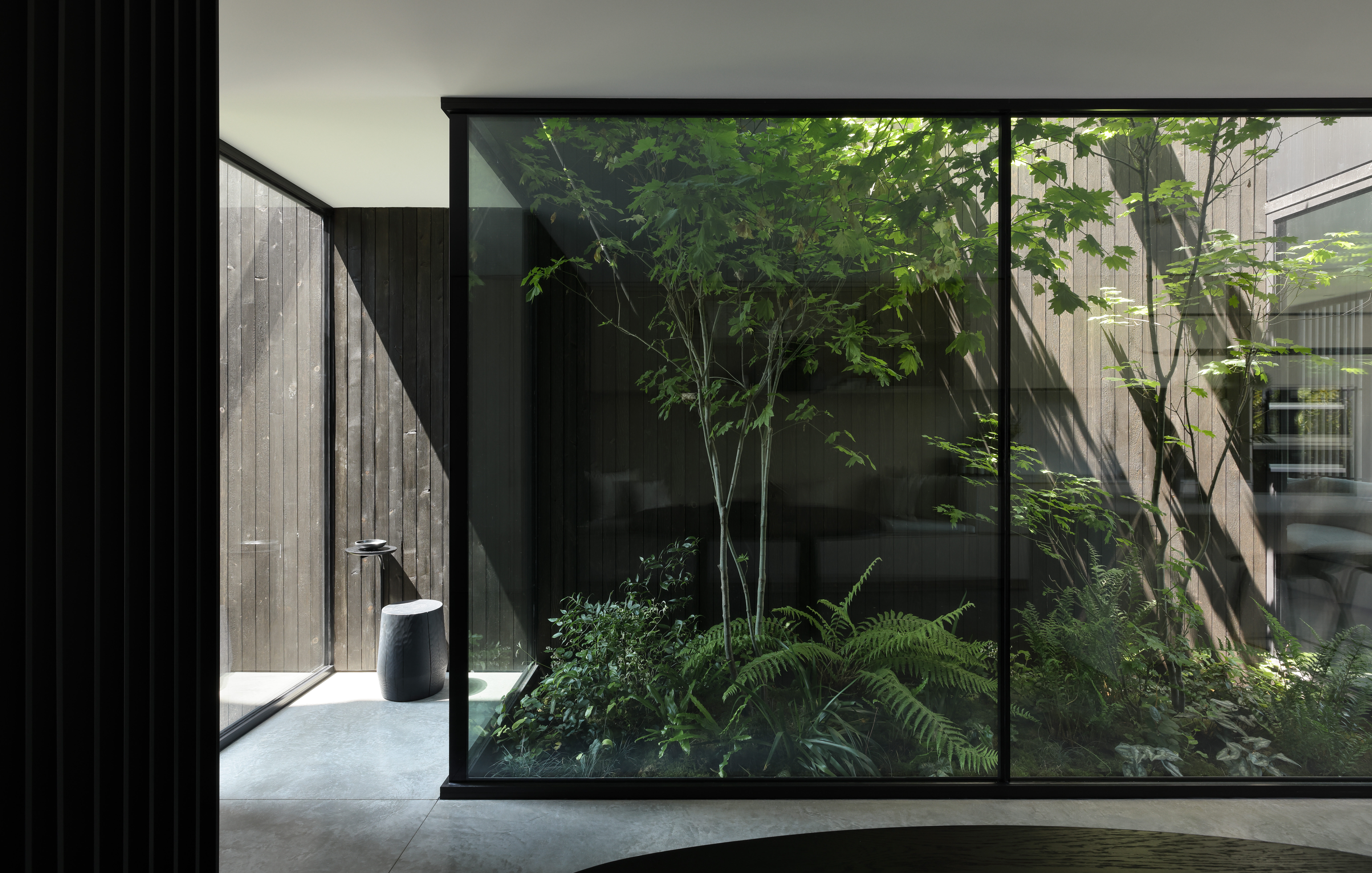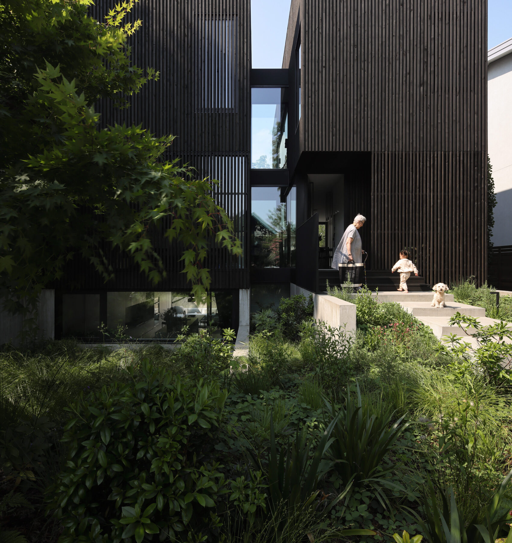 Located deep in a quiet and leafy neighbourhood, this multigenerational home stands proudly on a what is otherwise a typical single-family lot. As per the architecture of the buildings – a house and a garage – the gardens eschew some of the vernacular of this area: no front lawn, no formal privacy hedging. Found in the heart of the building is a narrow atrium that functions as a living tableau.