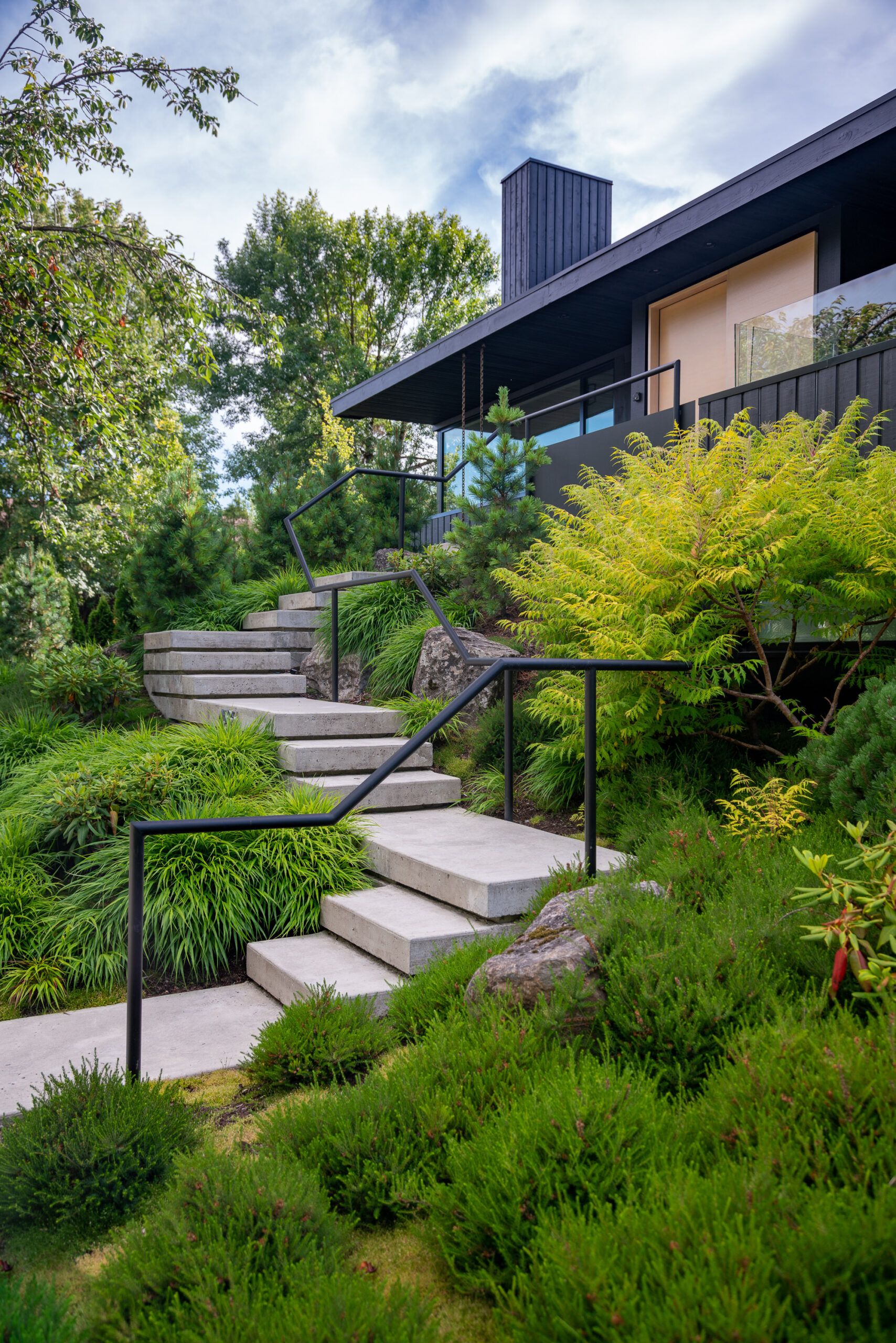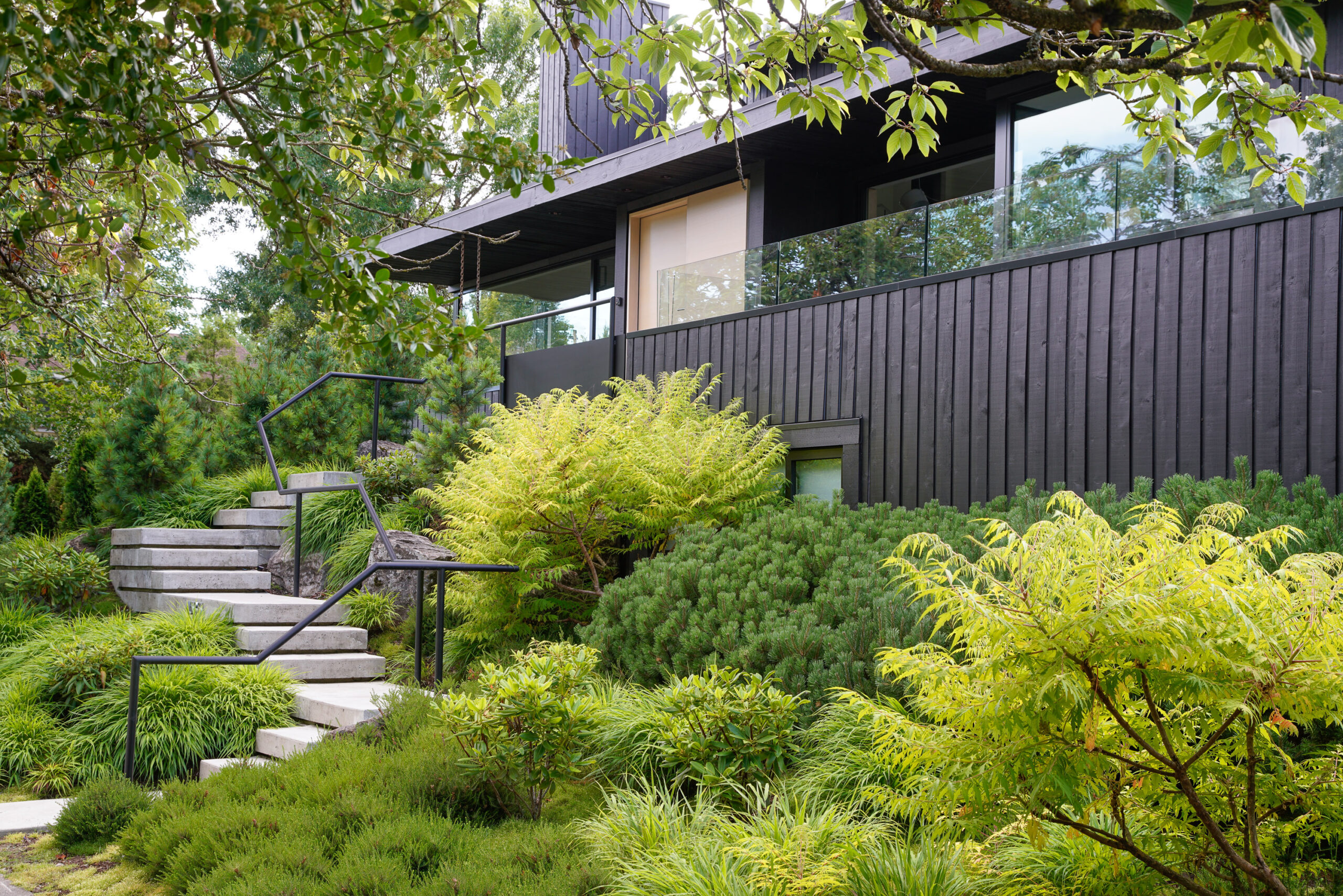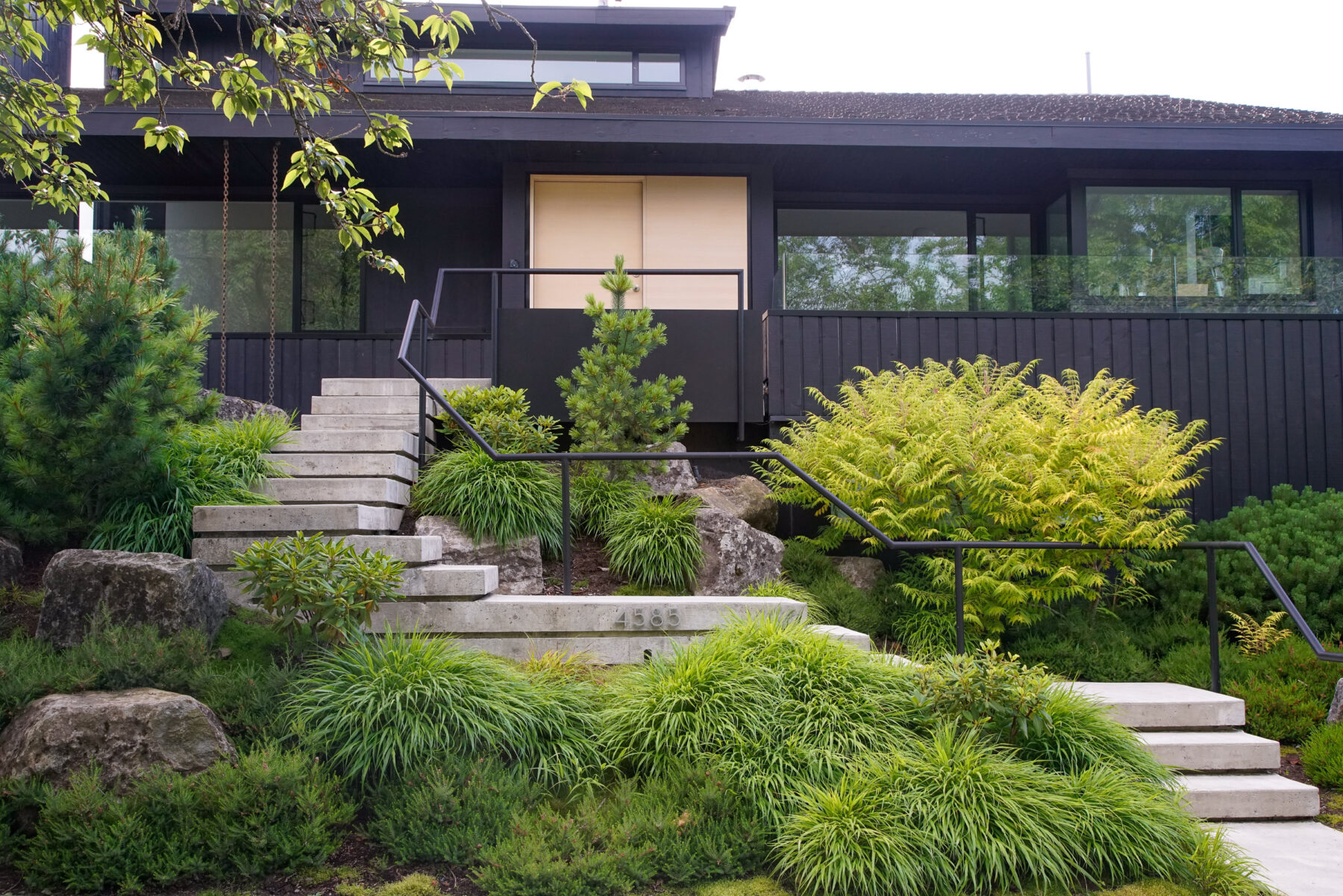 This creative house remodel triggered the reinvention of the entire garden layout, and has quickly become a neighbourhood favourite. Designed for a busy young family, the front slope was simply clothed in heather and grasses, with accents of golden-leaved sumacs, Swiss and mugo pines.