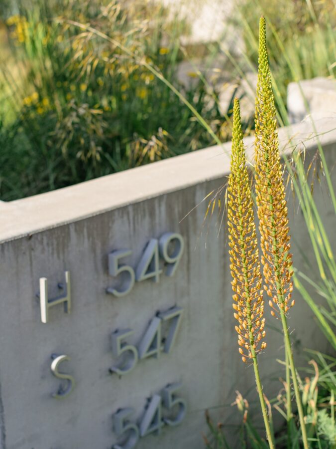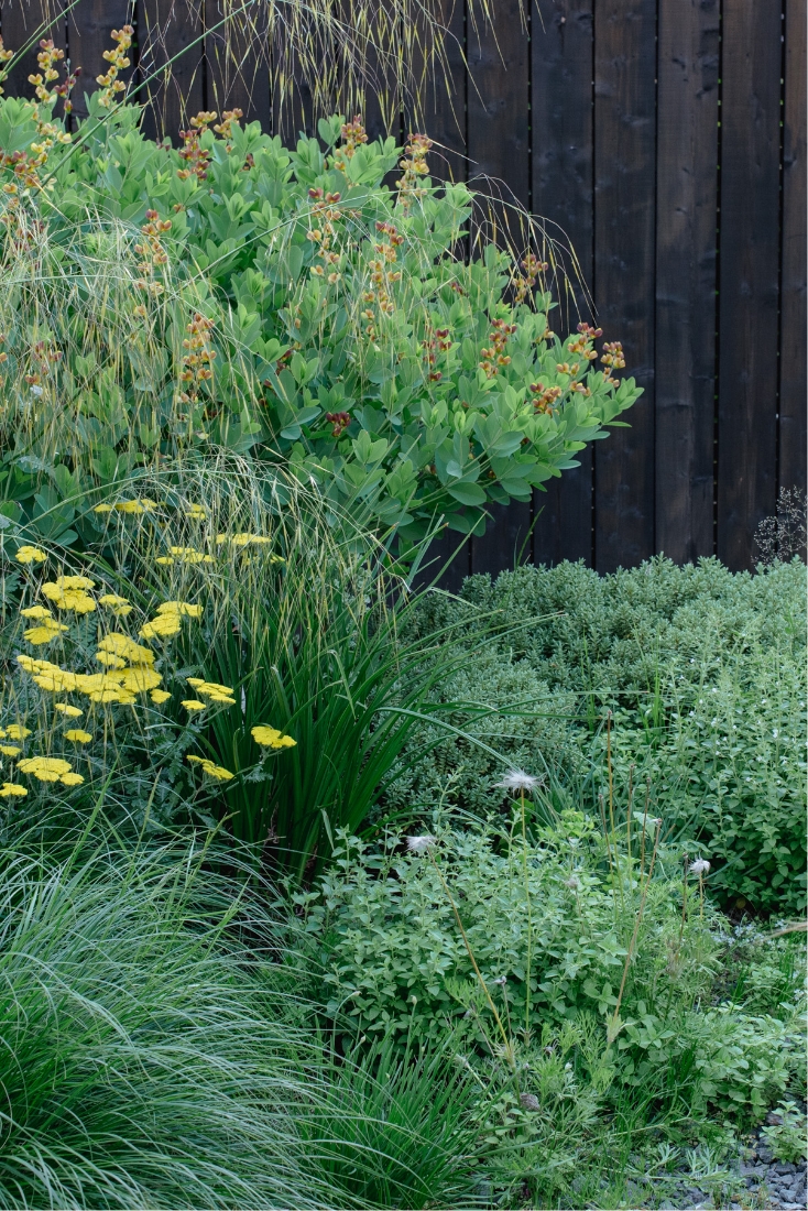 In the front yard, planting choices focus on low water and nutrient input, with emphasis on vibrant blooms during the midsummer peak.