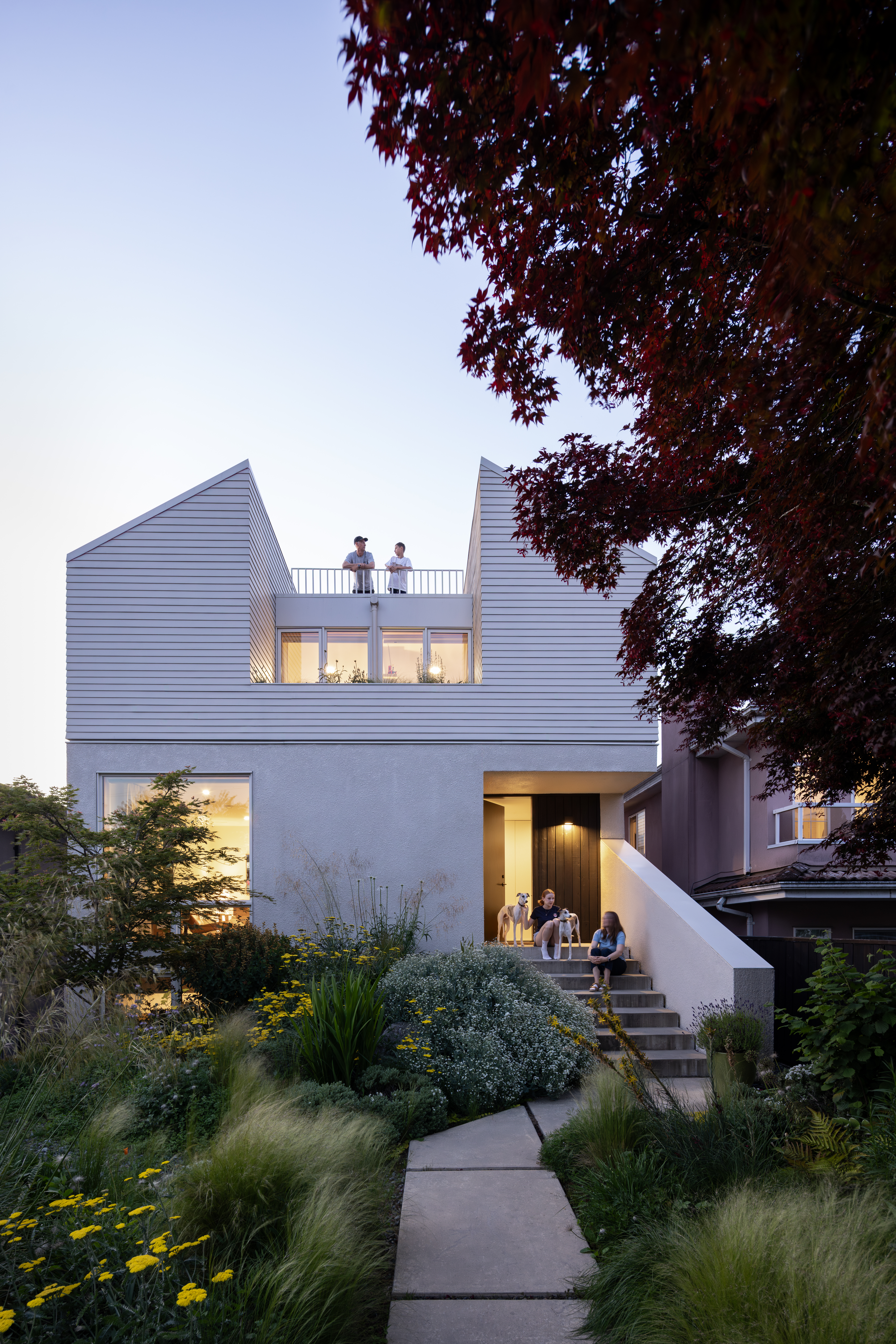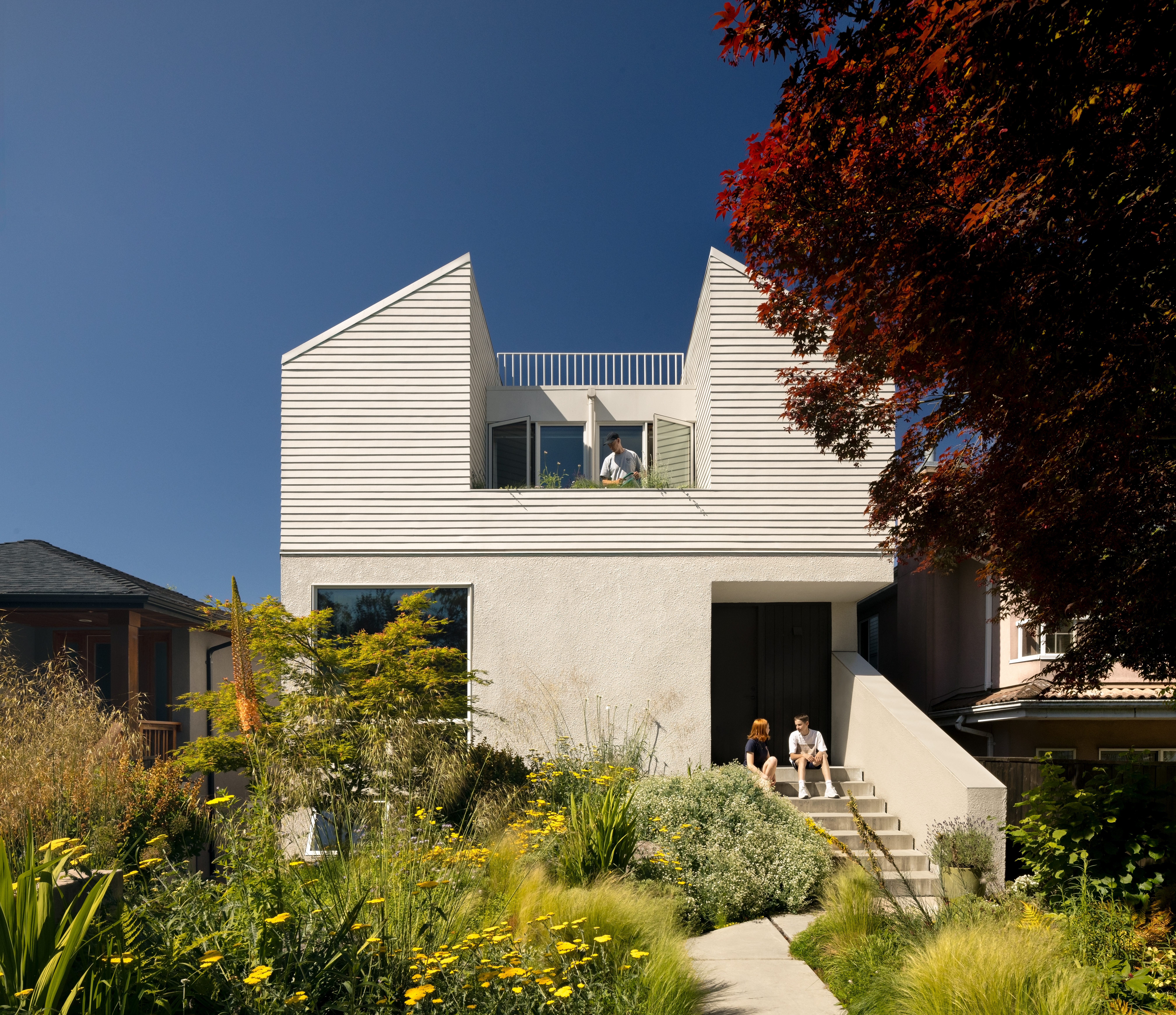 The goal of this renovation was to expand from one to three homes on the site. The landscape design prioritizes maximizing growing areas and plant diversity, offering residents the opportunity to cultivate their own gardens.